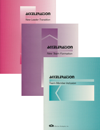 AccelerationRichard L. Hill Tools to reduce start-up time for new team leaders and members. Acceleration is a dynamic product series that can reduce the learning curve for new team leaders and team members by UP TO 6 MONTHS. Using a tested process of team activities and focused discussions, Acceleration shortens the start-up time needed for people to become acquainted with how things operate, identifies potential transition problems and agreed upon ways to approach them, and establishes ground rules that cover how the group will work together to ensure maximum effectiveness. The Acceleration activities work best when facilitated by a Trainer, O.D. Consultant, or Human Resource Professional. Administration guidelines are clearly described using the comprehensive Facilitator Guide. Select one or more of the following workbooks to meet your specific team needs: TEAM MEMBER INCLUSION Completion Time: 3 to 4 hours NEW TEAM FORMATION Completion Time: One full day NEW LEADER TRANSITION Completion Time: One Full Day |
